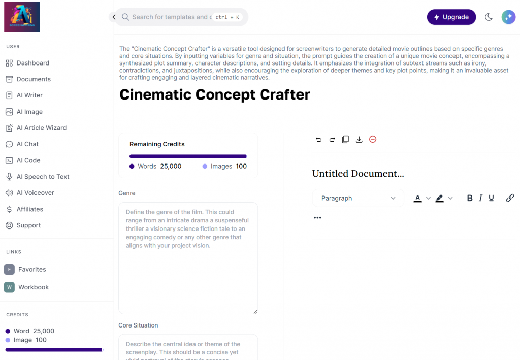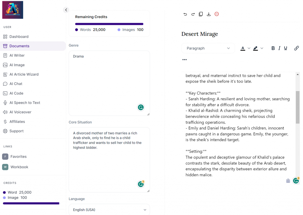 Unleash your stories with our AI-driven suite. In mere moments, we transform your ideas into scripts that are structured to captivate, dialogue that rings true, and character arcs that intrigue. We’re not just about words on a page; we’re about the dreams behind them, the raw emotions they evoke, and the unforgettable journeys they promise.